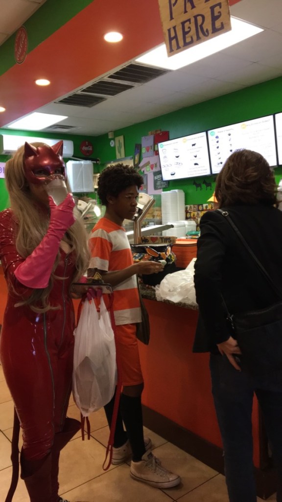 I laid low the next year and did some face painting at my church’s Halloween carnival, an event that used to be the highpoint of my calendar when I was a kid. For my freshman year at college, as many of you saw, I went as a black cat, my first step towards becoming a cat person.