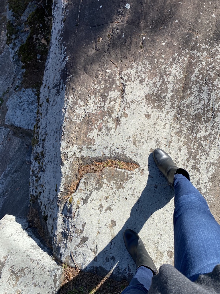 Me, climbing up on these high, rocky cliffs that border the campus, that students are allowed to sit on: