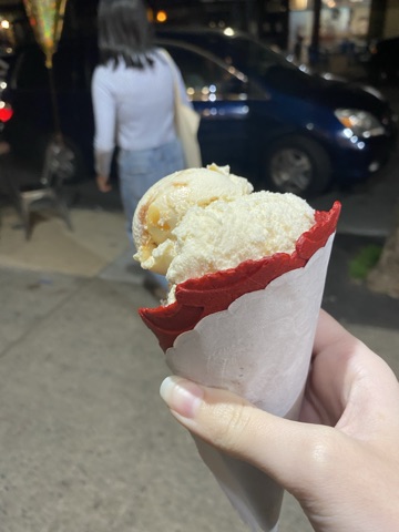Next door to Wild Ginger is Cookies N’ Cream, which- get this– serves nothing but cookies and ice cream. Assuming that the “salted caramel” ice cream flavor was, at the very least, chocolate with salted caramel, I ordered that in a red velvet cone, only to be disappointed when it was basically vanilla. I rectified the mistake a few weeks later by getting rocky road.