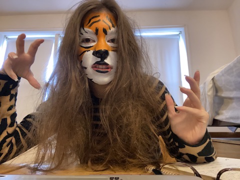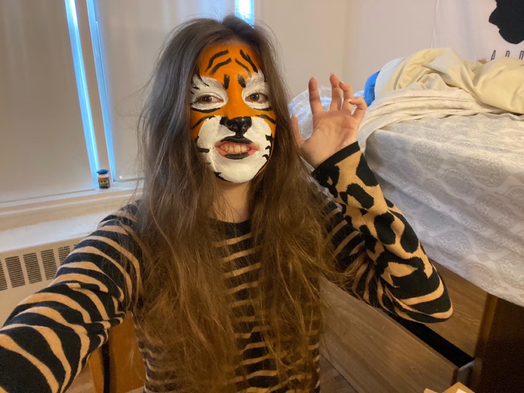 I was informed that presenting a class project in tiger face paint was “bad ass.” I also gained much approval from a campus security guard, the people who work in the cafeteria, and the professor in my next class. I viewed the whole thing as a weird metaphor for what it takes to do well academically at the end of the school year.