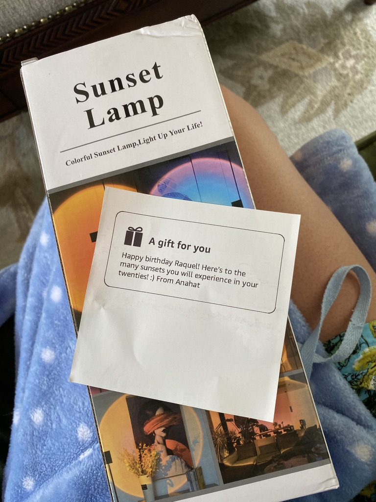 All of my gifts were perfect with handmade, chocolate covered strawberries and a bouquet of flowers from my best friend Padgett, a birthday haiku and one whole dollar from my friend Tyler, and a sunset lamp from my friend Anahat, that I can’t wait to use in my dorm room.