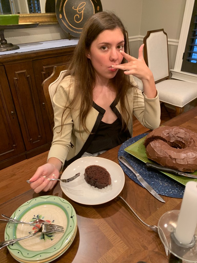 I continued with my karate that afternoon, because though I be but little, I be fierce, and then, finally, I had dinner with my parents, my great aunt Mac, and my grandmother. For my birthday dinner, my mother made me fried zucchini fettuccine, Stanley Tucci-style, and bleu cheese steak tips, Chrissy Teigen-style, plus some chocolate cake.