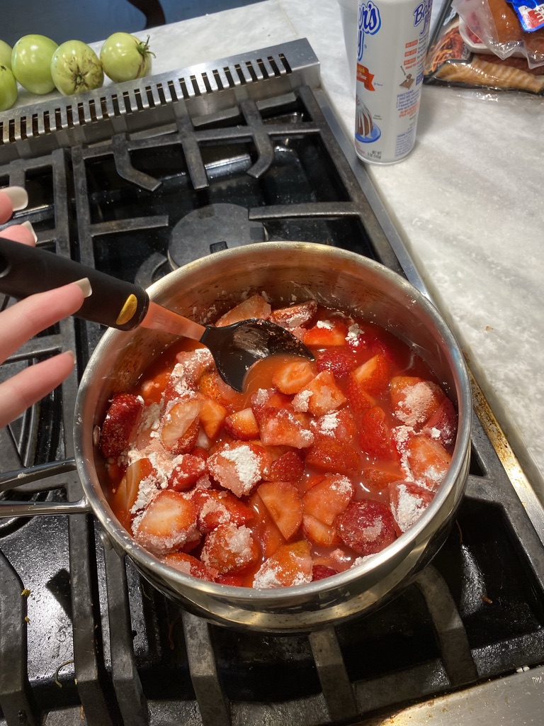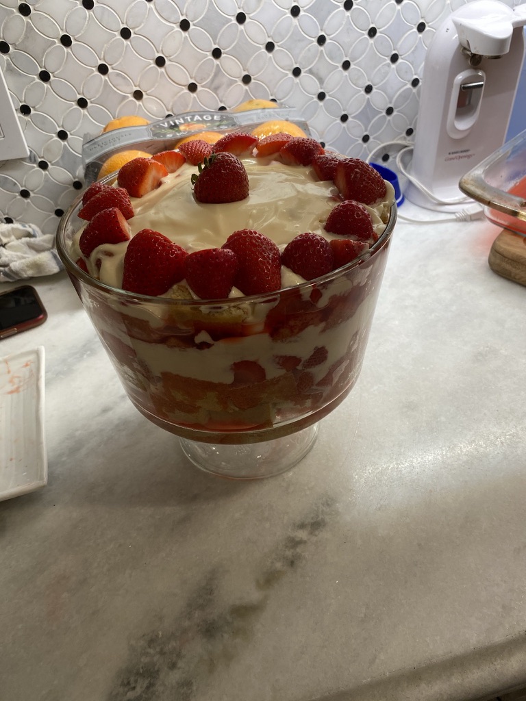 It was a BYOB Fourth of July celebration, in which we brought an entire pitcher of white sangria, and since I also got tapped to bring a dessert, I spent the morning making a strawberry shortcake trifle with my mother. There’s something about making a strawberry shortcake trifle for a Fourth of July party, while sixties music played in the background, that made me feel like a sixties housewife. In the weird hypothetical I made up in my head, I was making the strawberry shortcake trifle using a recipe that I found in a lady’s home journal with a frilly apron over my Leave it to Beaver dress.