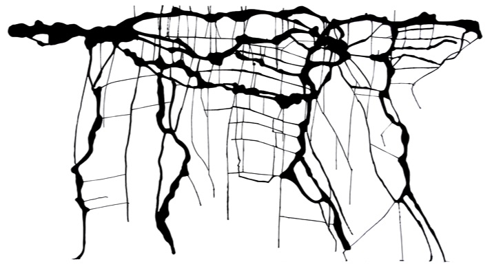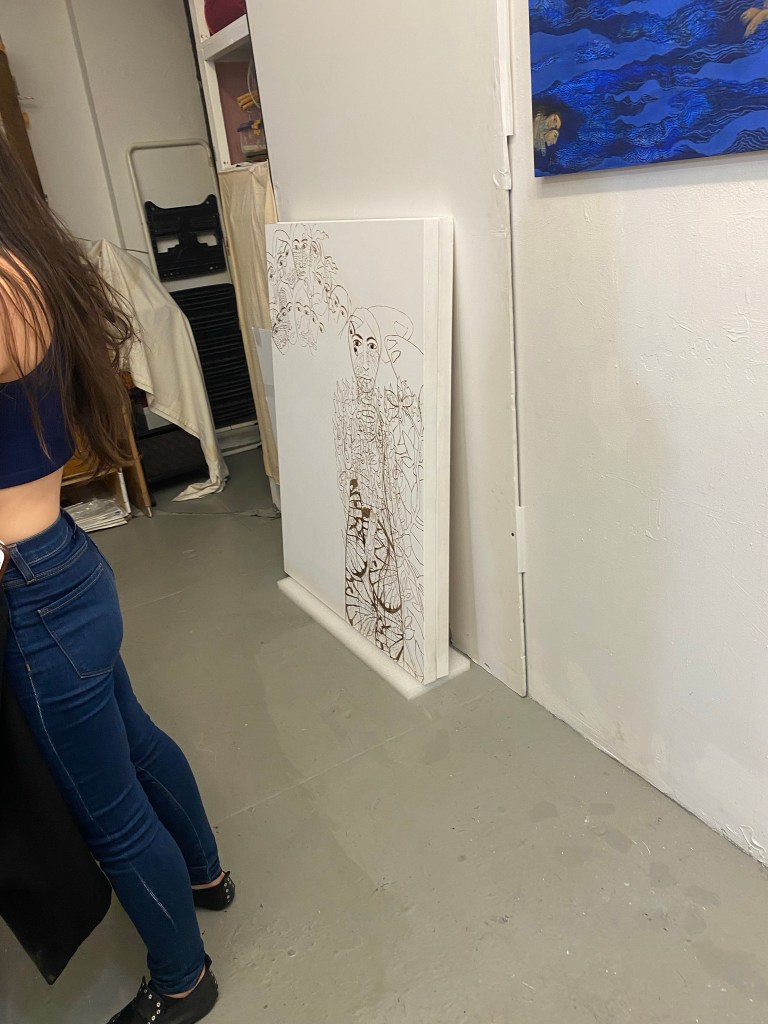The idea for the art event was that each floor had a set number of artists on it and that you went into the room that interested you most. We started with Mahmoud Hamadani, an Iranian artist and personal friend of Valentina’s whose black ink paintings reminded me of Pollock’s drip paintings. They are beautifully simplistic and lacking that sense of chaos that comes easily to jet-black abstract paintings.