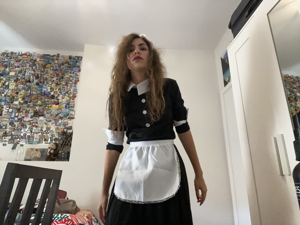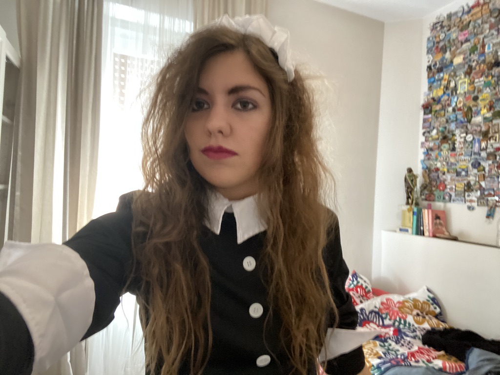 Twas my time to shine. I went to a hole in the wall store to buy my Halloween costume a few days earlier and put together my Magenta look using the off brand Wednesday Addams costume they sell under the title of “gothic school girl costume” and their maid apparel.