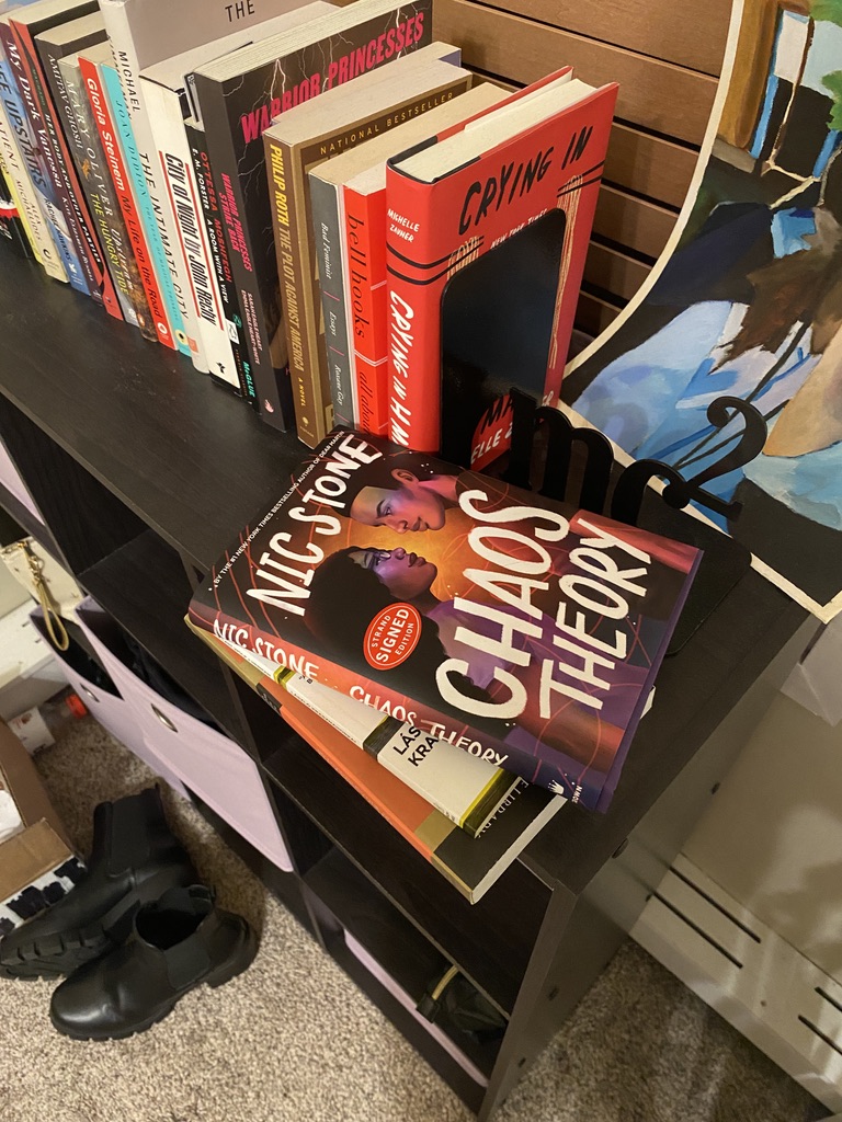 A few weeks ago, I attended another book event at The Strand. This time, it was for the first ever book event for “Chaos Theory” by Nic Stone, a YA novel about mental health and romance. This was my first introduction to the work of Nic Stone and I am sold. Nic Stone, one of the most banned authors in America spoke beautifully about censorship, representation, and content warnings, all while remaining upbeat and funny throughout the night. She wore an amazing skirt, green lipstick, phenomenal hoop earrings, and a t-shirt that said “we need more thinkers” (hard agree). Her conversation with E. Lockhart felt more like a conversation between friends that we were all lucky enough to witness than it did a regular book event. She was even kind enough to answer my question about content warnings with a great answer.