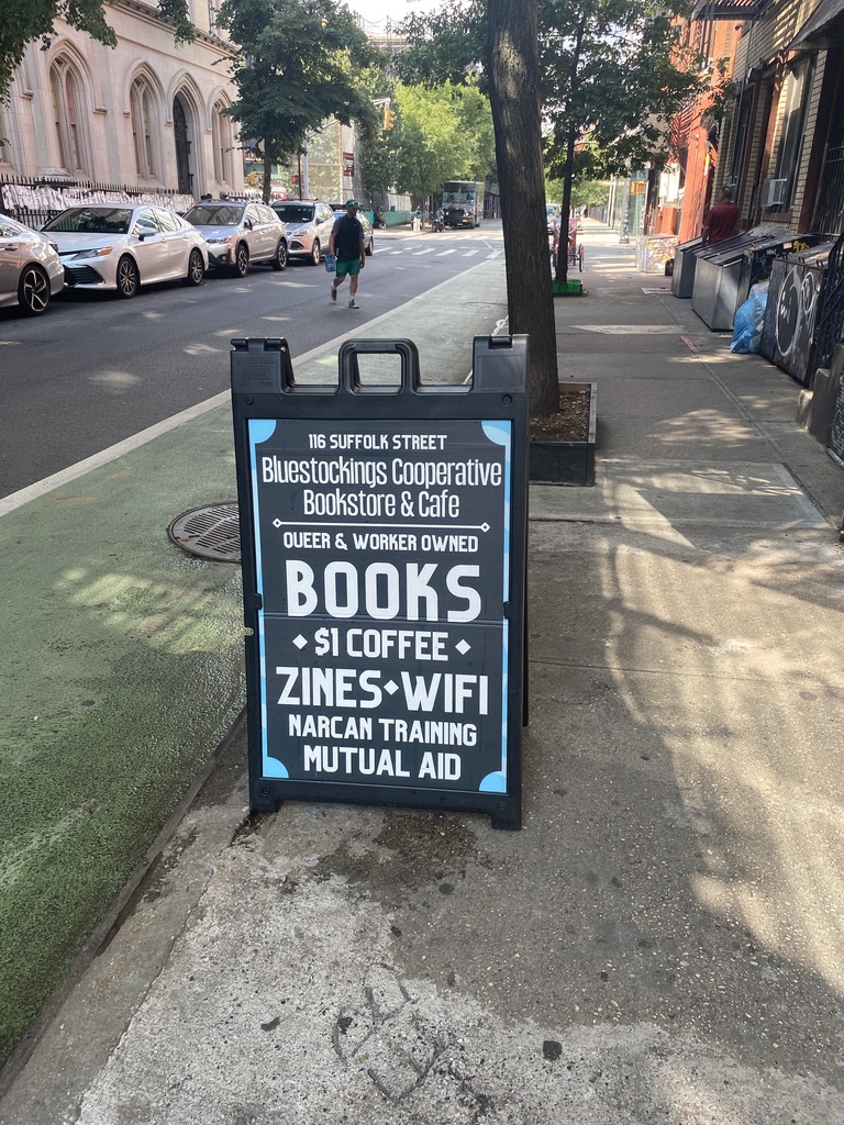I witnessed the two workers there treat a homeless man very kindly, giving him an empty store bag when he walked into their store shirtless and asked for one. I met a fellow Raquel, wearing a t-shirt calling for “more trans bodies in art.” Bluestockings Cooperative makes a trip to a bookstore, which is already a fun time, even more of an event.
