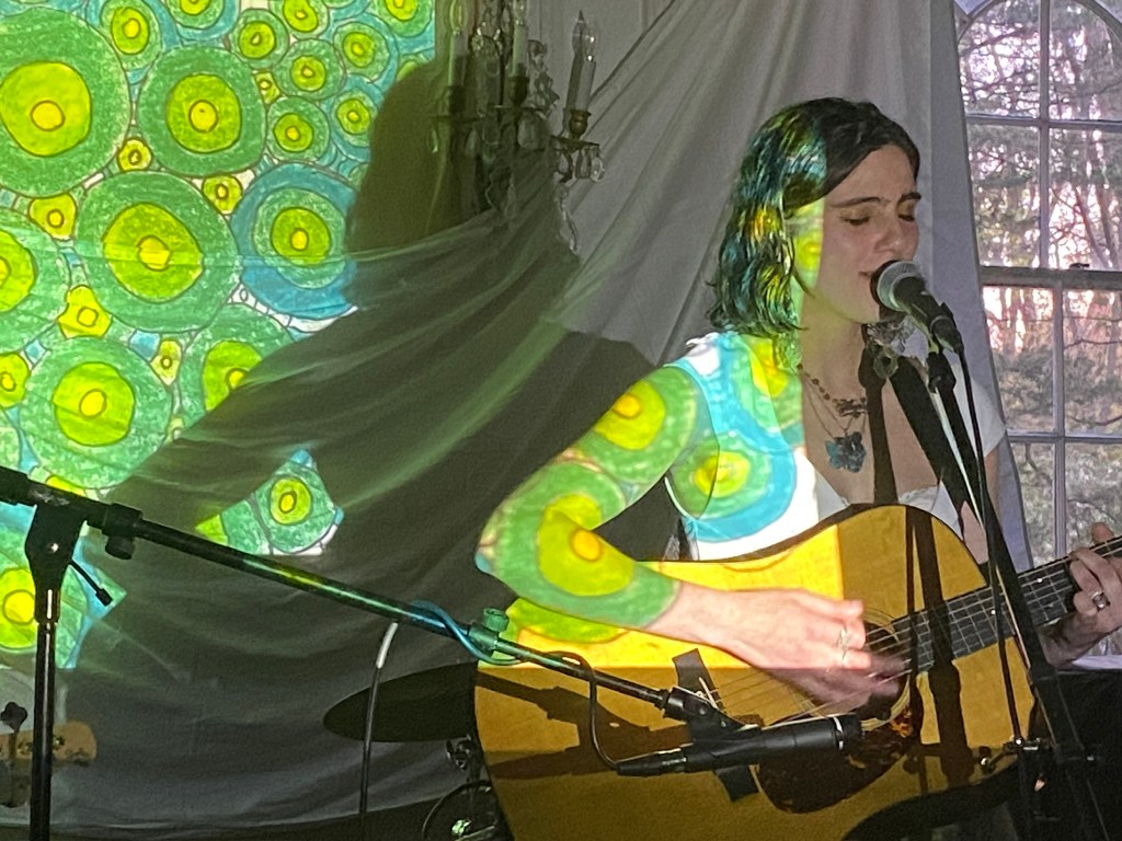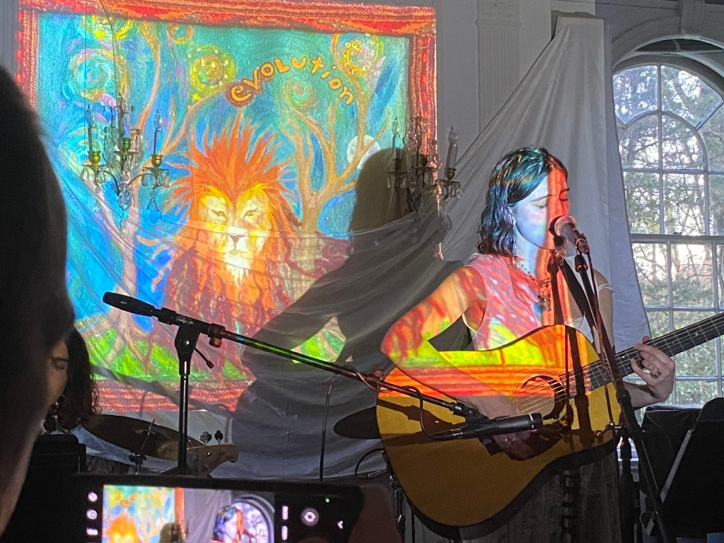 For the event, Alyssa was putting on a real show, the closest thing that an undergrad can have to a Vegas act. Projected behind her was all of the artwork she had for each song and standing beside her for the beginning of each song was one of her friends wearing a dress that she made herself.