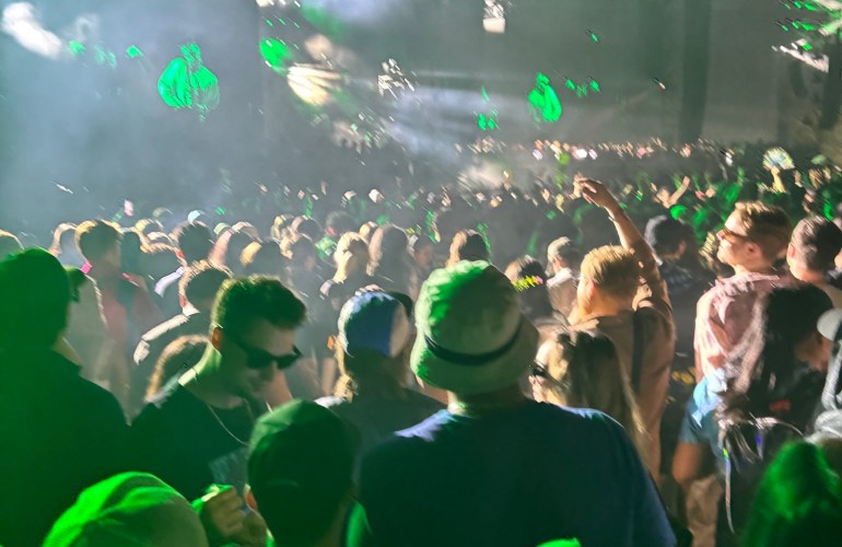 Experts Only was the whole nine yards: food stalls, merch stands, beach balls bouncing off the top of the crowd, a woman dancing on stage at all times, and someone who was clearly on ecstasy and therefore not dancing at all to the beat. The whole thing was like a big high school football game, only instead of school spirit you were