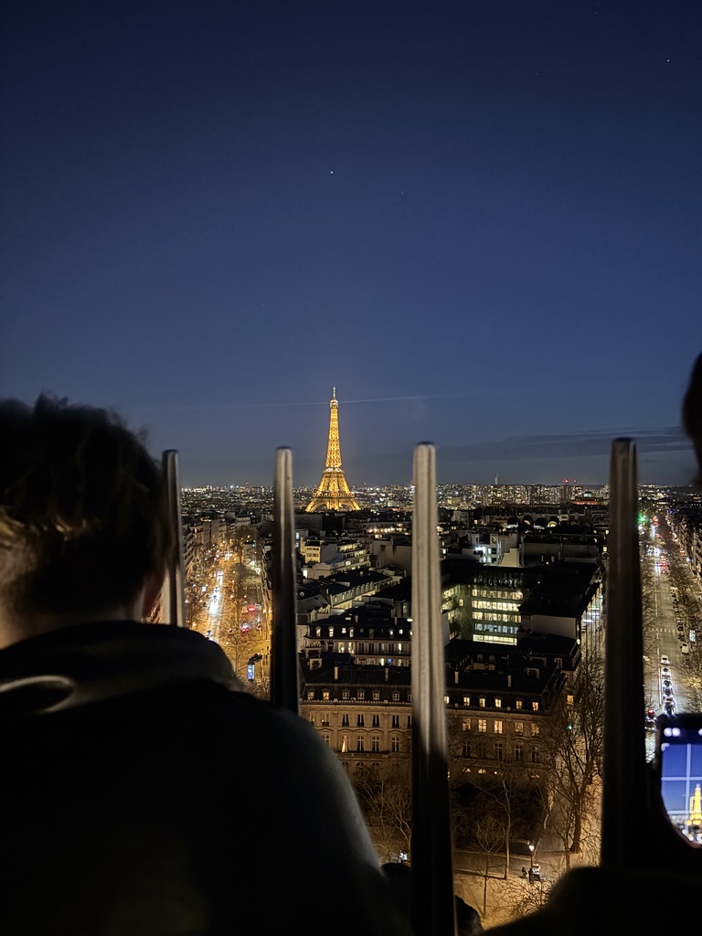 Standing at the top of the arc, I got an incredible view of the city. By now, it was night time and after glimpsing the Tuileries Garden as the sun was setting, I was able to see the City of Lights while it was all lit up. From the top of the Arc de Triomphe, I could see the Eiffel Tower and its beam cutting across the sky.